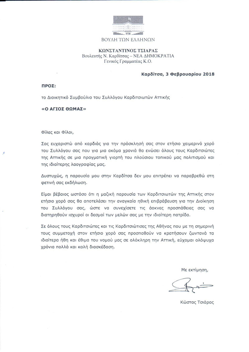 Με πολύ κέφι και χορό έγινε η Ετήσια Χοροεσπερίδα του Συλλόγου Καρδιτσιωτών Αττικής «Ο Άγιος Θωμάς» το Σάββατο 03 Φεβρουαρίου 2018 στην ταβέρνα «Ο Γιώργος» στην Νέα Μάκρη.